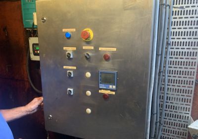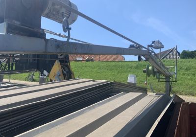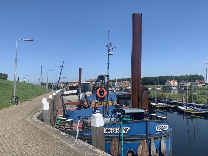 Kraanschip met CvO, dubbelschroefs, spudpalen, en oude werkende Sennebogen kraan.