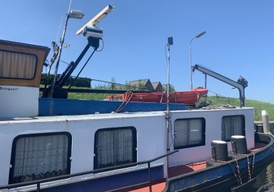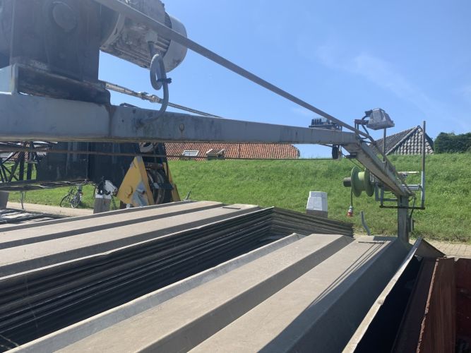 Kraanschip met CvO, dubbelschroefs, spudpalen, en oude werkende Sennebogen kraan.
